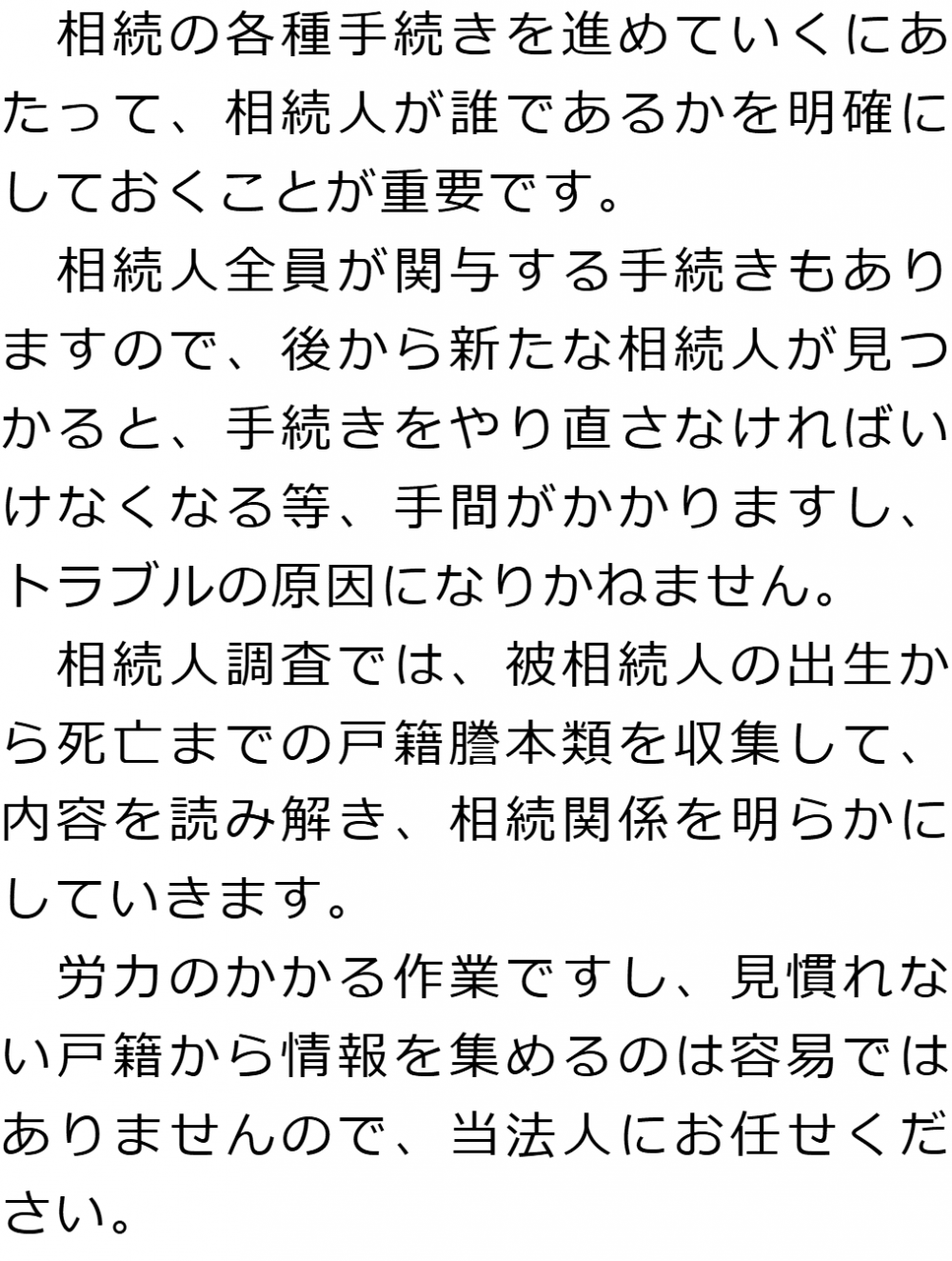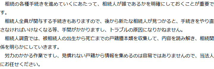 トップ業務内容相続人調査 階層構造▼ 業務内容(目次) 相続人調査 業務内容(目次)業務内容トップ行政書士法人心の業務内容遺言遺産整理相続人調査相続財産調査遺産分割協議書の作成預金・貯金の解約・名義変更証券口座の解約・名義変更自動車の名義変更心グループのその他の業務内容家族信託・民事信託節税対策事業承継遺言の検認相続放棄限定承認遺産分割遺留分侵害額請求相続登記相続税申告相続税調査 受付時間 平日 9時~21時、土日祝 9時~18時 夜間・土日祝の相談も対応します (要予約) 所在地 〒272-0023 千葉県市川市南八幡4-8-9ニューグリーンビル5F 0120-2403-39 お問合せ・アクセス・地図