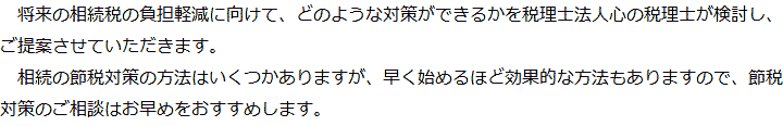 トップ業務内容節税対策 階層構造▼ 業務内容(目次) 節税対策 業務内容(目次)業務内容トップ行政書士法人心の業務内容遺言遺産整理相続人調査相続財産調査遺産分割協議書の作成預金・貯金の解約・名義変更証券口座の解約・名義変更自動車の名義変更心グループのその他の業務内容家族信託・民事信託節税対策事業承継遺言の検認相続放棄限定承認遺産分割遺留分侵害額請求相続登記相続税申告相続税調査 受付時間 平日 9時~21時、土日祝 9時~18時 夜間・土日祝の相談も対応します (要予約) 所在地 〒272-0023 千葉県市川市南八幡4-8-9ニューグリーンビル5F 0120-2403-39 お問合せ・アクセス・地図