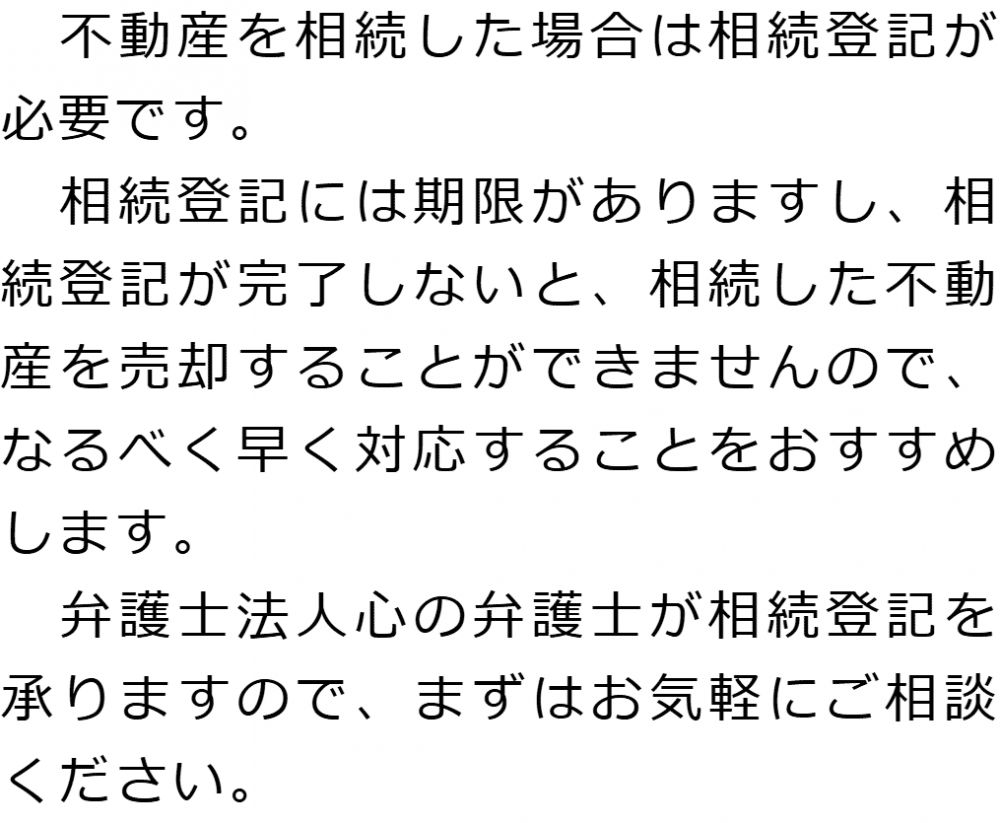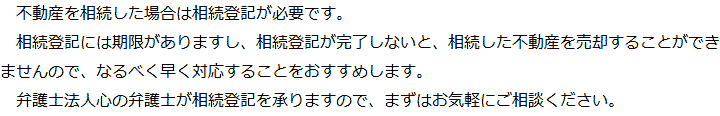 トップ業務内容相続登記 階層構造▼ 業務内容(目次) 相続登記 業務内容(目次)業務内容トップ行政書士法人心の業務内容遺言遺産整理相続人調査相続財産調査遺産分割協議書の作成預金・貯金の解約・名義変更証券口座の解約・名義変更自動車の名義変更心グループのその他の業務内容家族信託・民事信託節税対策事業承継遺言の検認相続放棄限定承認遺産分割遺留分侵害額請求相続登記相続税申告相続税調査 受付時間 平日 9時~21時、土日祝 9時~18時 夜間・土日祝の相談も対応します (要予約) 所在地 〒272-0023 千葉県市川市南八幡4-8-9ニューグリーンビル5F 0120-2403-39 お問合せ・アクセス・地図